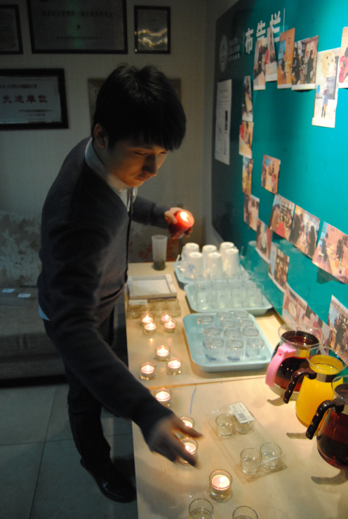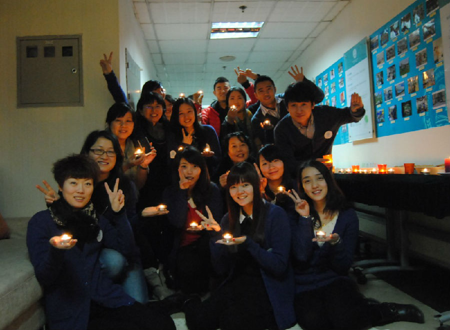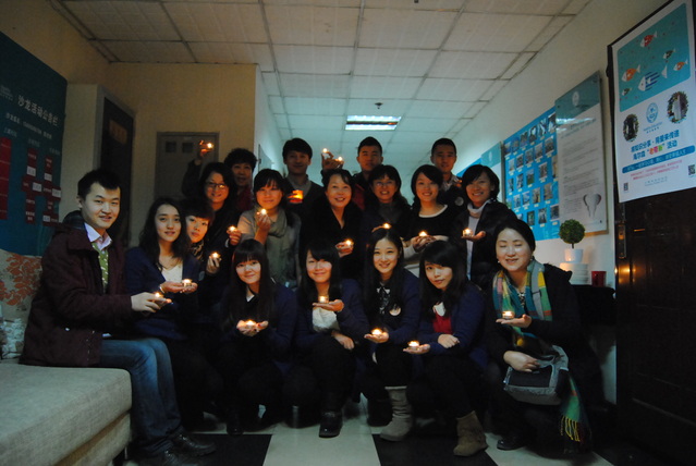 夜幕降临,三个校区的员工都来到了小寨校区,史总说咱们照张相吧。于是我们就在楼道里手里端着小小的祈愿蜡烛,就是封面照片。只不过,按下快门的是小海…