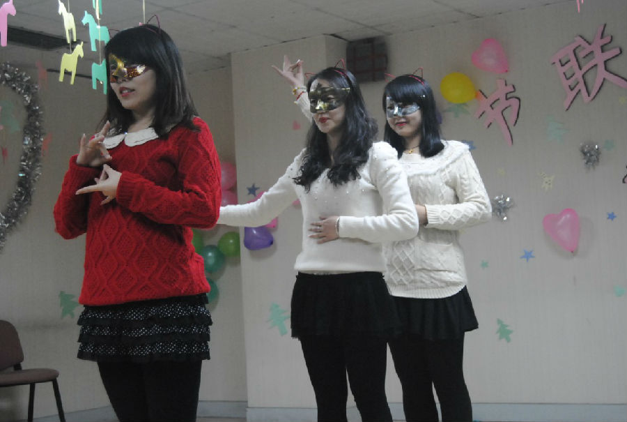 四医大校区的三位美女干嘛呢?她们的节目是舞蹈串烧,小海还纳闷怎么没有《最炫民族风》呢?不过,三位美女带来的是热门单曲《what the fox say》。