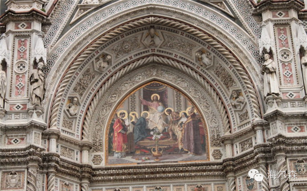 圣母百花大教堂是佛罗伦萨的地标建筑,共计历时一百五十年建成,其圆顶是由米开朗基罗设计,花费了十四年的时间建造。粉红、绿、奶油白三色将较的大理石展现出女性高贵优雅的气质,所以又称为“花的圣母寺”。